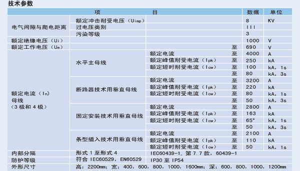 3、三級(jí)和四級(jí)水平母線系統(tǒng)其額定電流可至4000A;